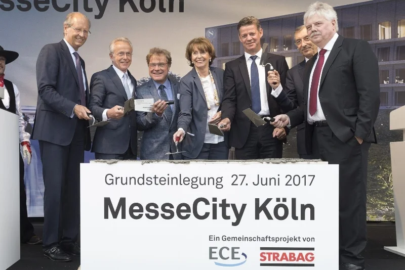 Im Beisein zahlreicher Gäste haben die Projektpartner STRABAG Real Estate (SRE) und ECE den Grundstein für das Großprojekt MesseCity Köln im Stadtteil Deutz gelegt. Rund neun Monate nach dem ersten Spatenstich fand gestern die feierliche Zeremonie statt, bei der Oberbürgermeisterin Henriette Reker, Dr. Thomas Birtel, Vorstandsvorsitzender der STRABAG SE, ECE-Geschäftsführer Dr. Andreas Mattner, Marcus Nagel, Vorstandsvorsitzender der Zurich Gruppe Deutschland, Hans-Joachim Lehmann, Geschäftsführer der HIH Real Estate GmbH, sowie die Geschäftsführer der MesseCity Köln GmbH Torsten Kuttig und Rainer M. Schäfer selbst zur Kelle griffen. Der Grundstein mitsamt der traditionellen „Zeitkapsel“ wird im Projektverlauf von der bauausführenden Ed. Züblin AG in die Grundmauern der Gebäude eingesetzt.